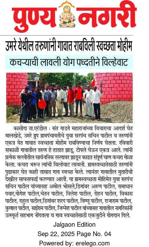 ग्रामपंचायत मालखेडे-उमरे यांच्या पुढाकाराने स्थानिक युवकांनी कचरा संकलन व स्वच्छता उपक्रम राबवून पर्यावरण जनजागृती घडवली. स्वच्छतेची गरज आणि गावातील कचरा व्यवस्थापन याबद्दल नागरिकांमध्ये जागरूकता निर्माण करण्यासाठी रविवारी सकाळी हा उपक्रम आयोजित करण्यात आला.