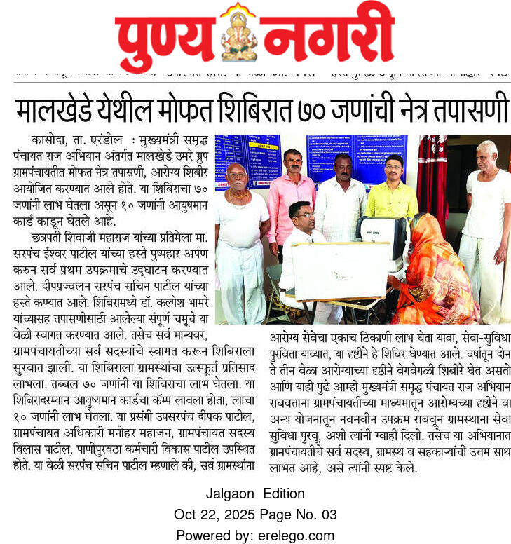 मुख्यमंत्री समृद्ध पंचायत अभियानांतर्गत मालखेडे–उमरें ग्रुप ग्रामपंचायतीत मोफत नेत्र तपासणी शिबिर आयोजित करण्यात आले. या शिबिरात सुमारे ७० नागरिकांची डोळ्यांची तपासणी करण्यात आली आणि गरजू लाभार्थ्यांना आयुष्मान कार्ड वितरित करण्यात आले.